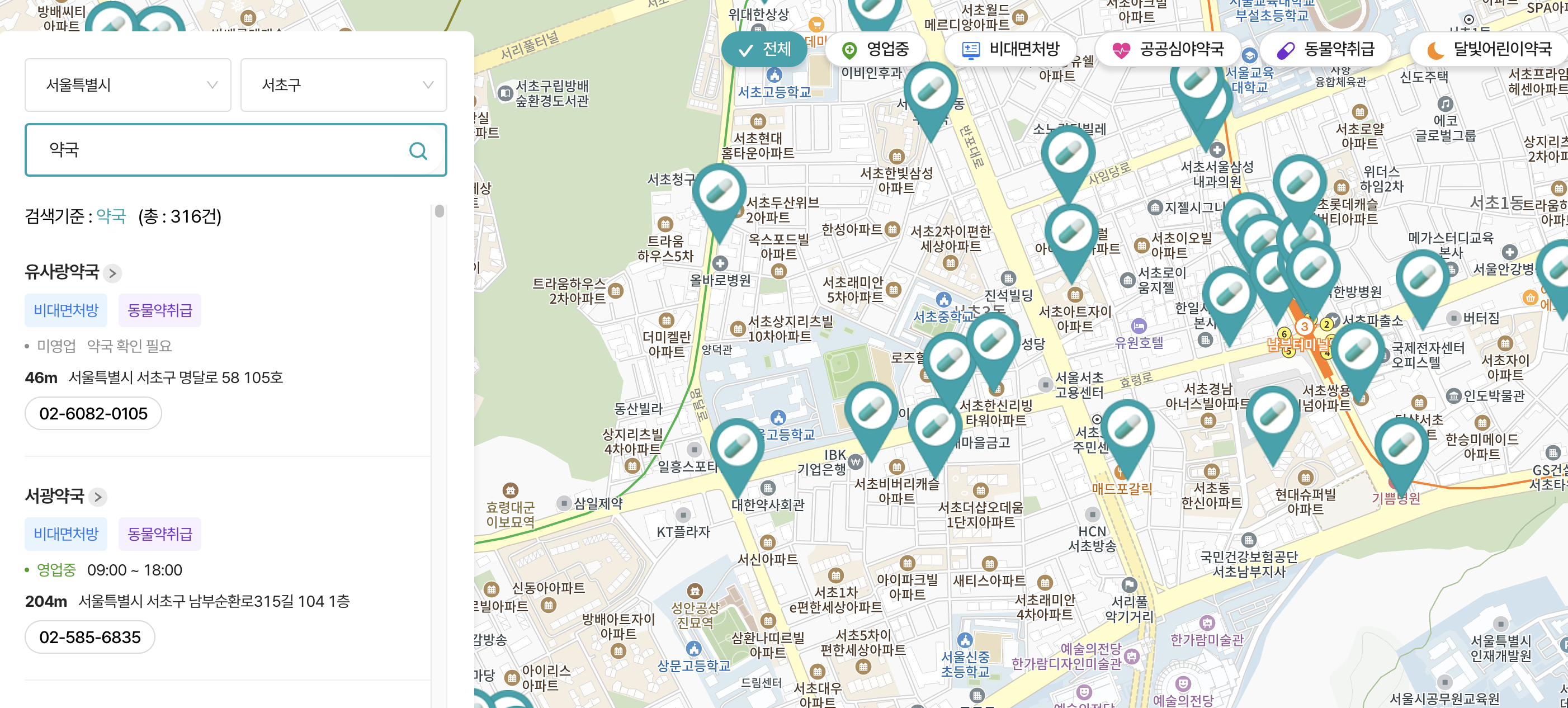 휴일에 어느 약국이 문을 여는지 찾기 어려울때가 있다. 대한 약사회에서는 이런 불편을 해소하기 위해 휴일에 오픈하는 약국 정보를 사이트로 제공하고 있다.