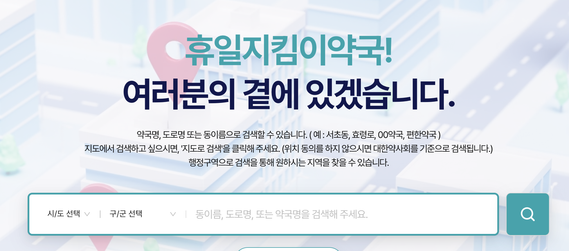 휴일지킴이약국! 여러분곁에 있습니다. 지금 운영 중인 약국부터 심야약국까지! 휴일지킴이약국이 여러분의 건강을 지켜드리겠습니다.