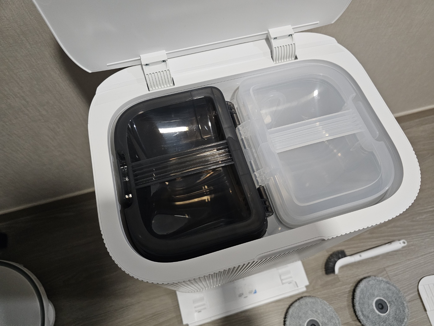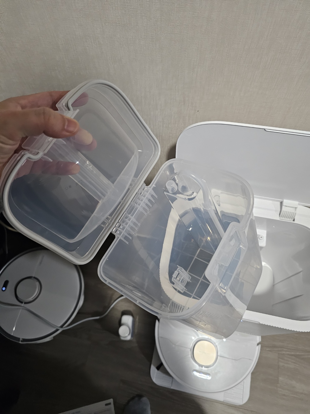 물통은 로보락에 비해서 좀 싸구려 같아 보였다. 근데 투명이라 잘 보여서 좋긴했다. 뚜껑만 좀 고급스럽게 바꾸면 될 듯.