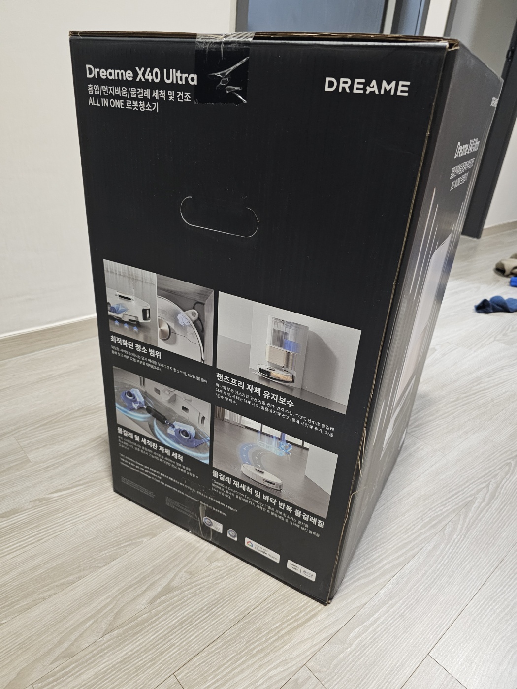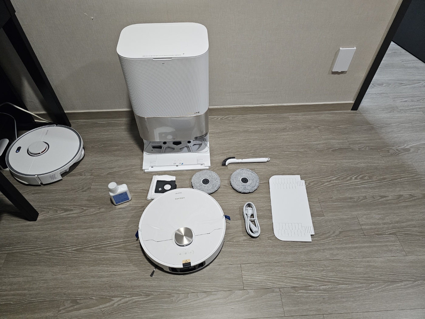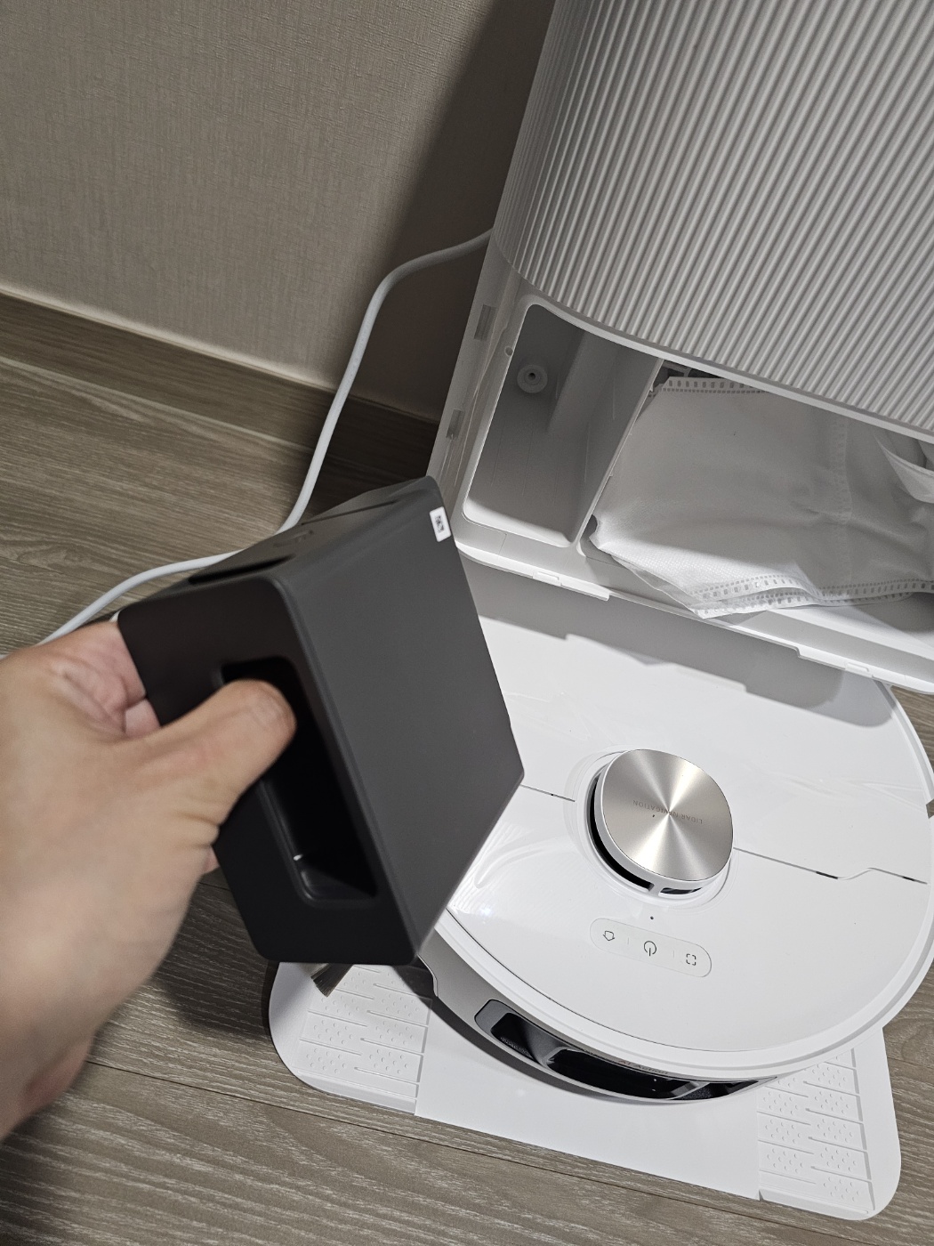 신기하게 로봇청소기가 옆으로 세워져 있었다. 도크가 로보락에 비해서 얇았으나 높이가 커서 저렇게 넣은듯 싶다.