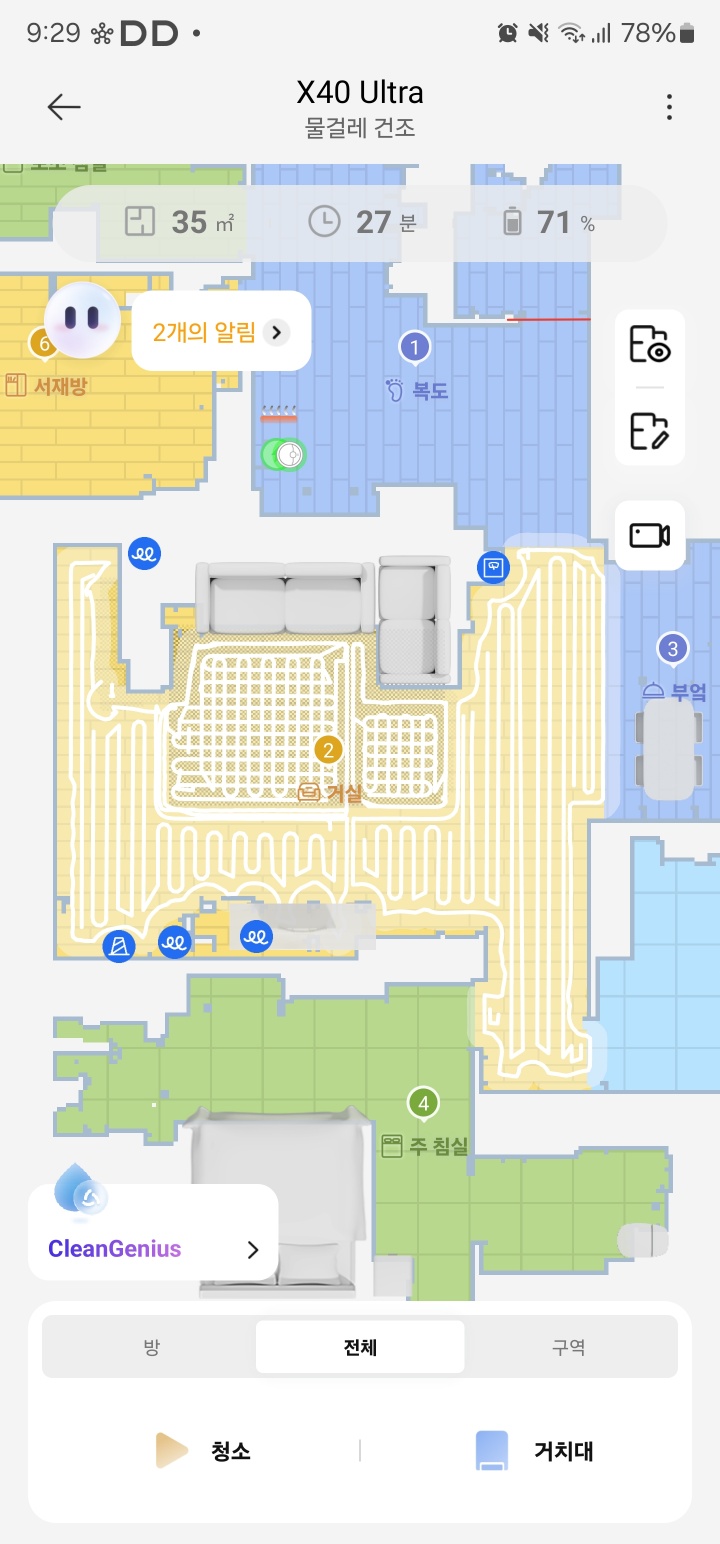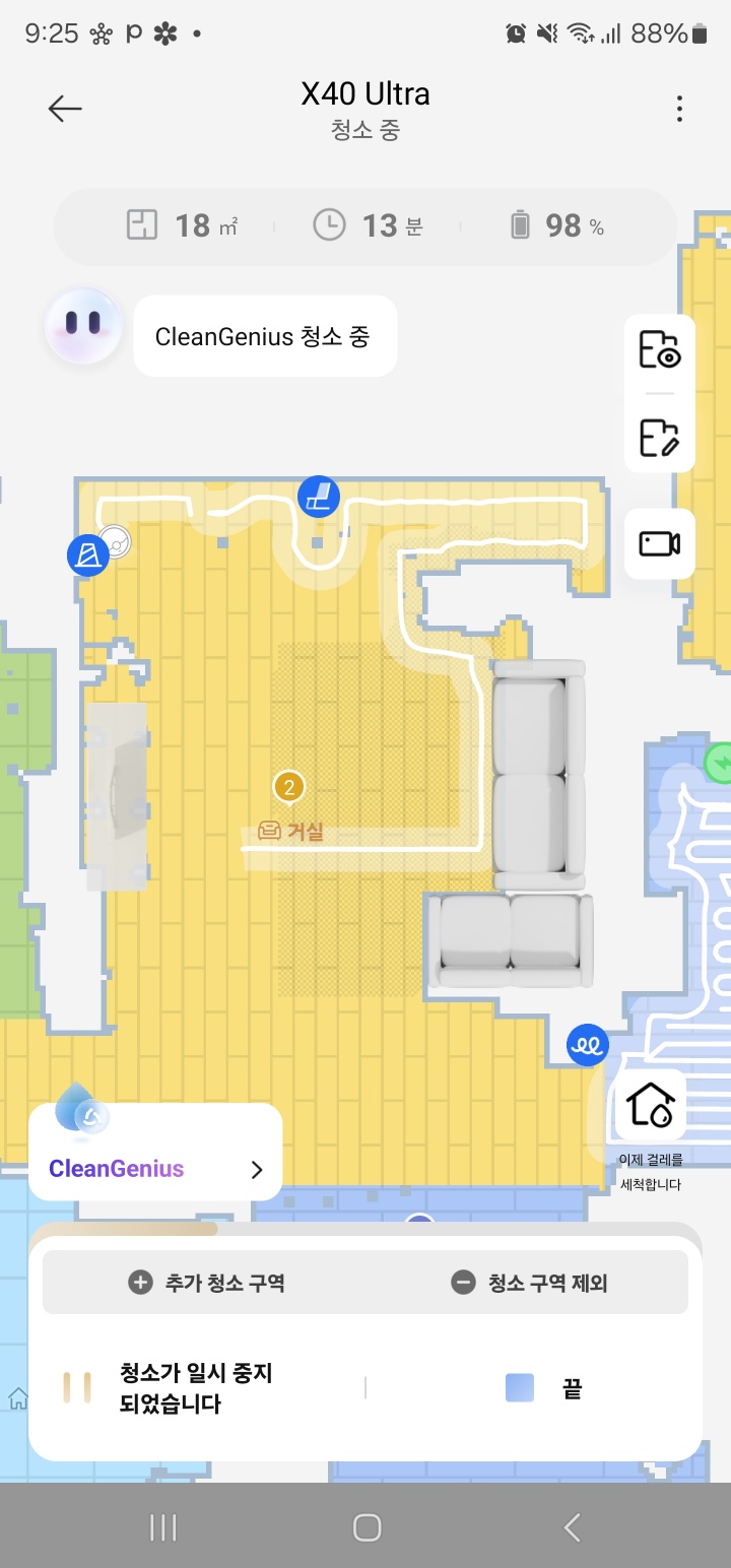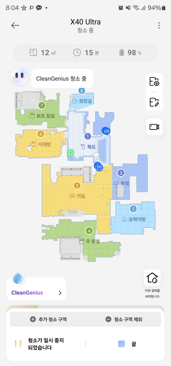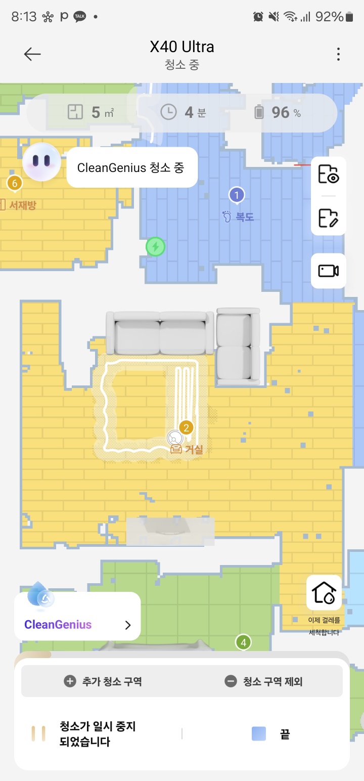 그리고 한가지 좋은 점은 청소를 시작한 후에 현재 청소구역을 쉽게 제외(건너뛰기)가 가능하다는 점이다. 테스트를 하면서 1번 복도를 청소하고 있을때 청소구역제외 버튼을 누르니 바로 2번 거실로 이동하여 청소를 계속했다.
