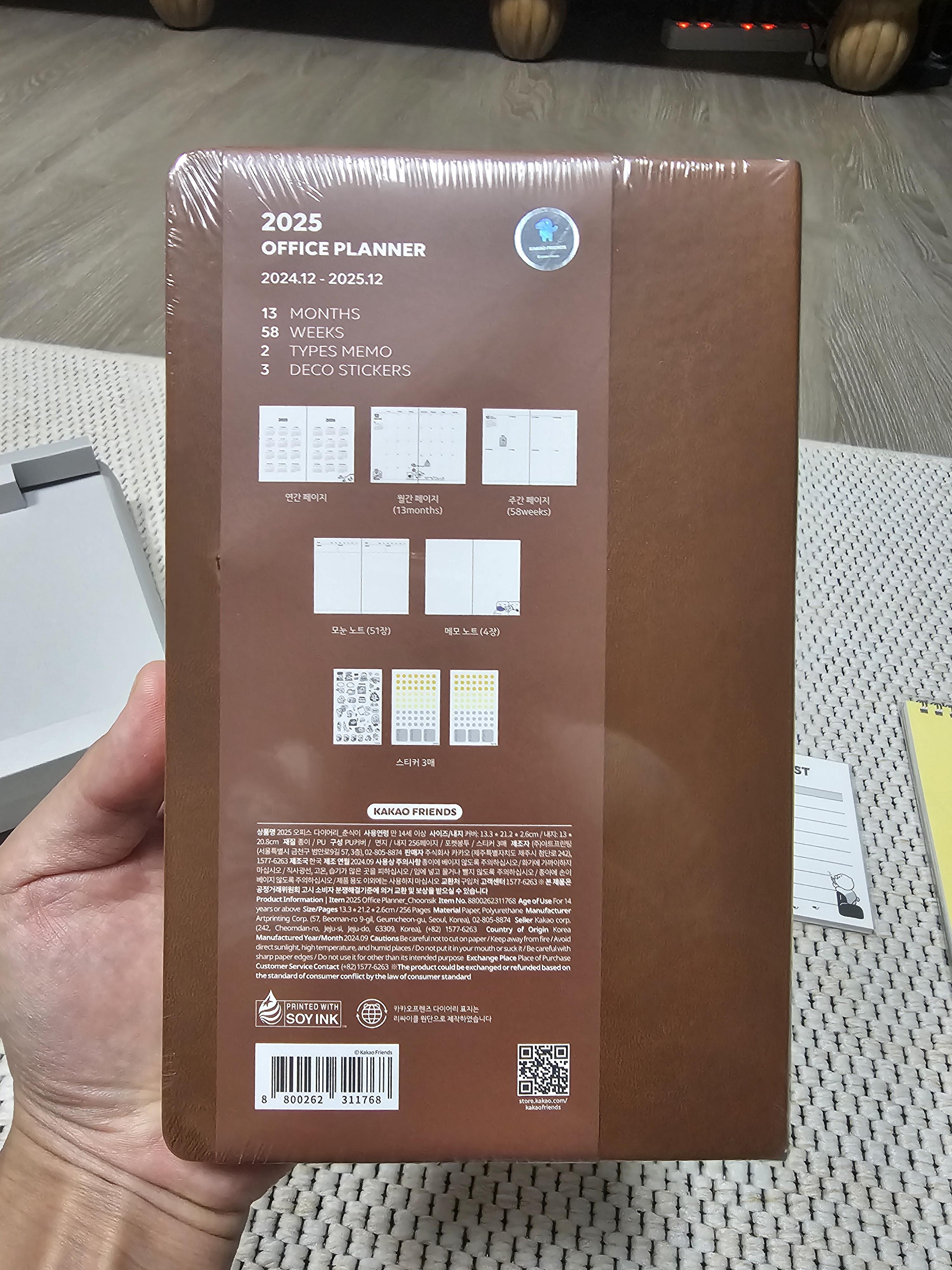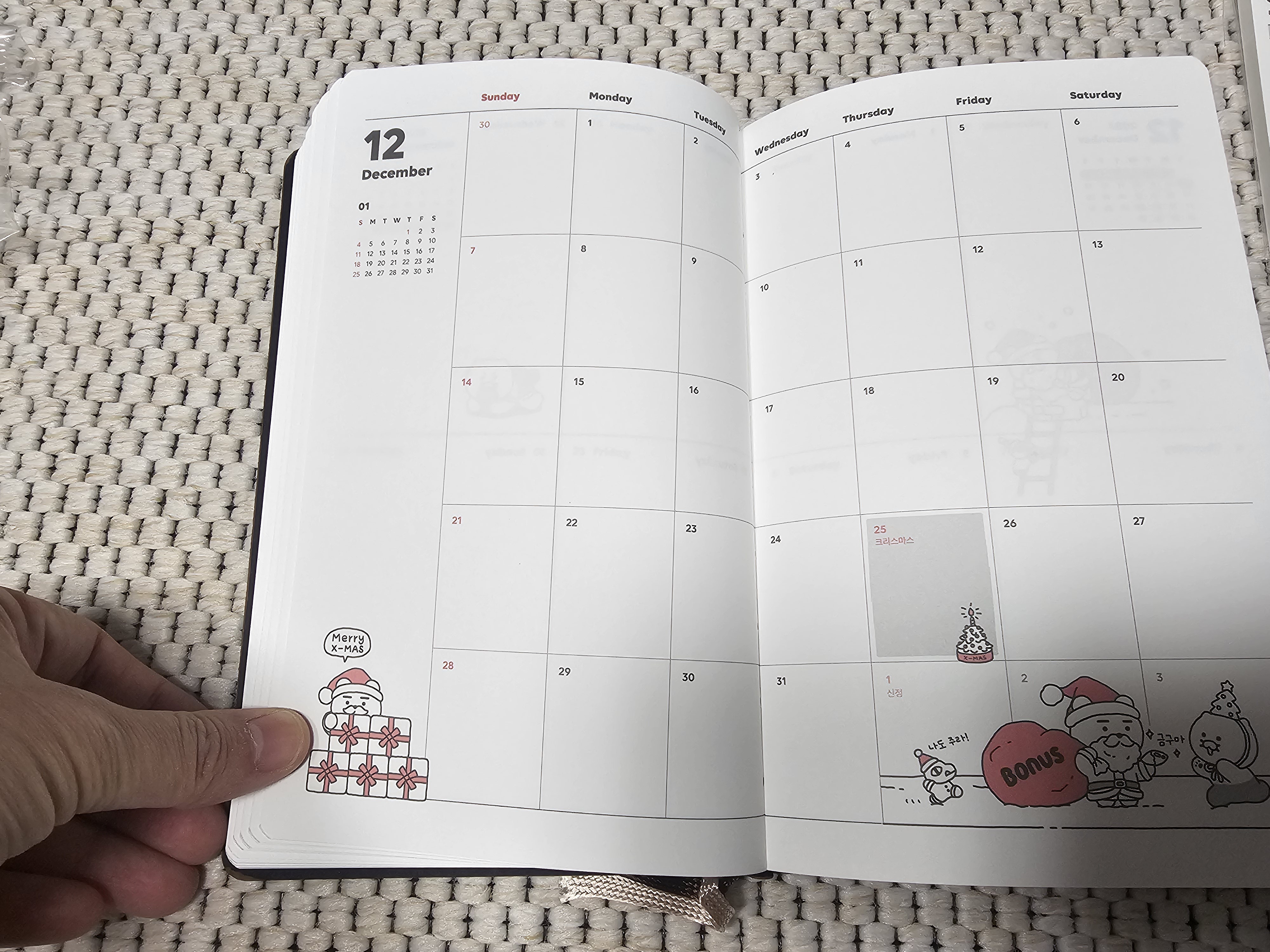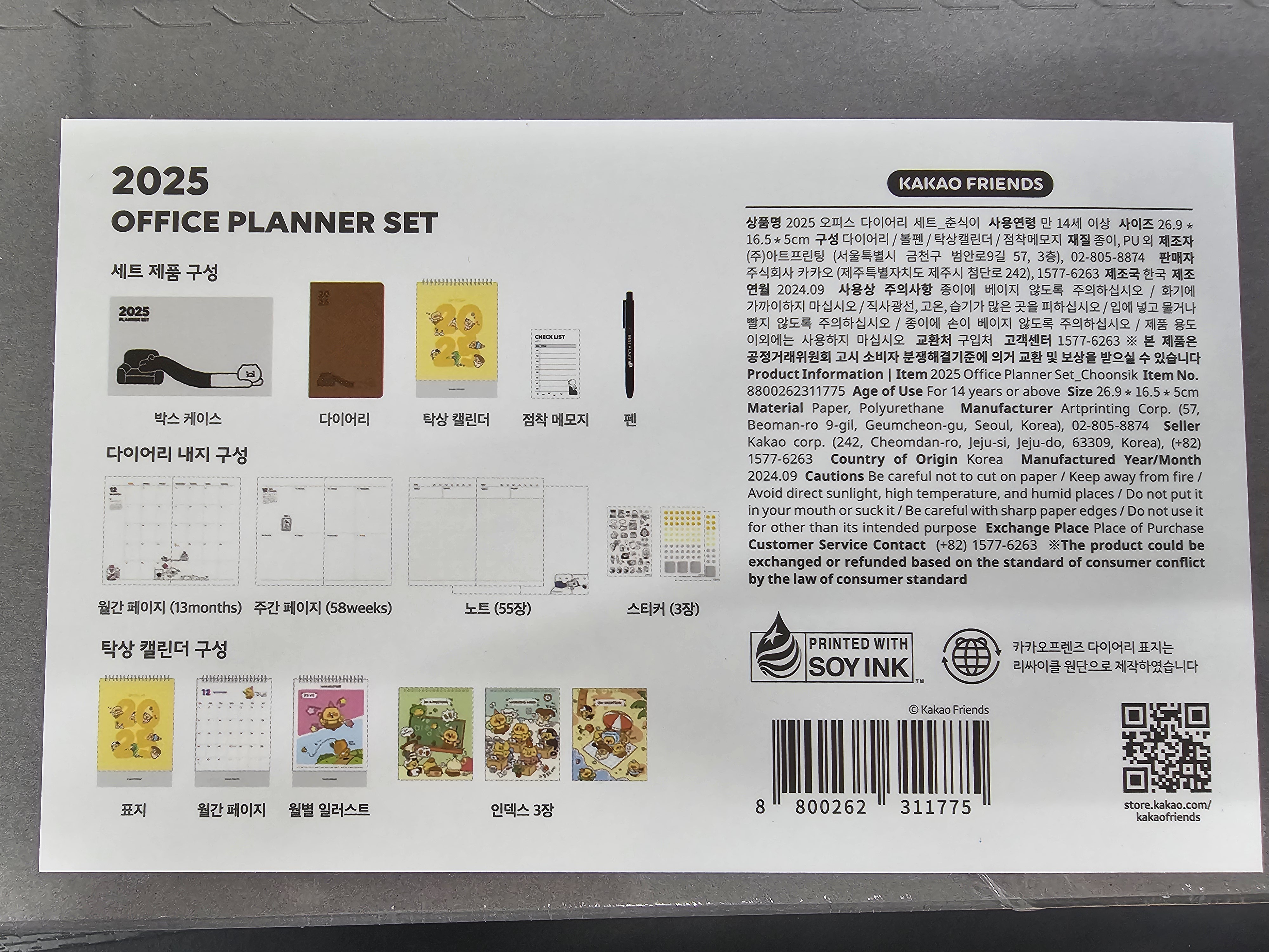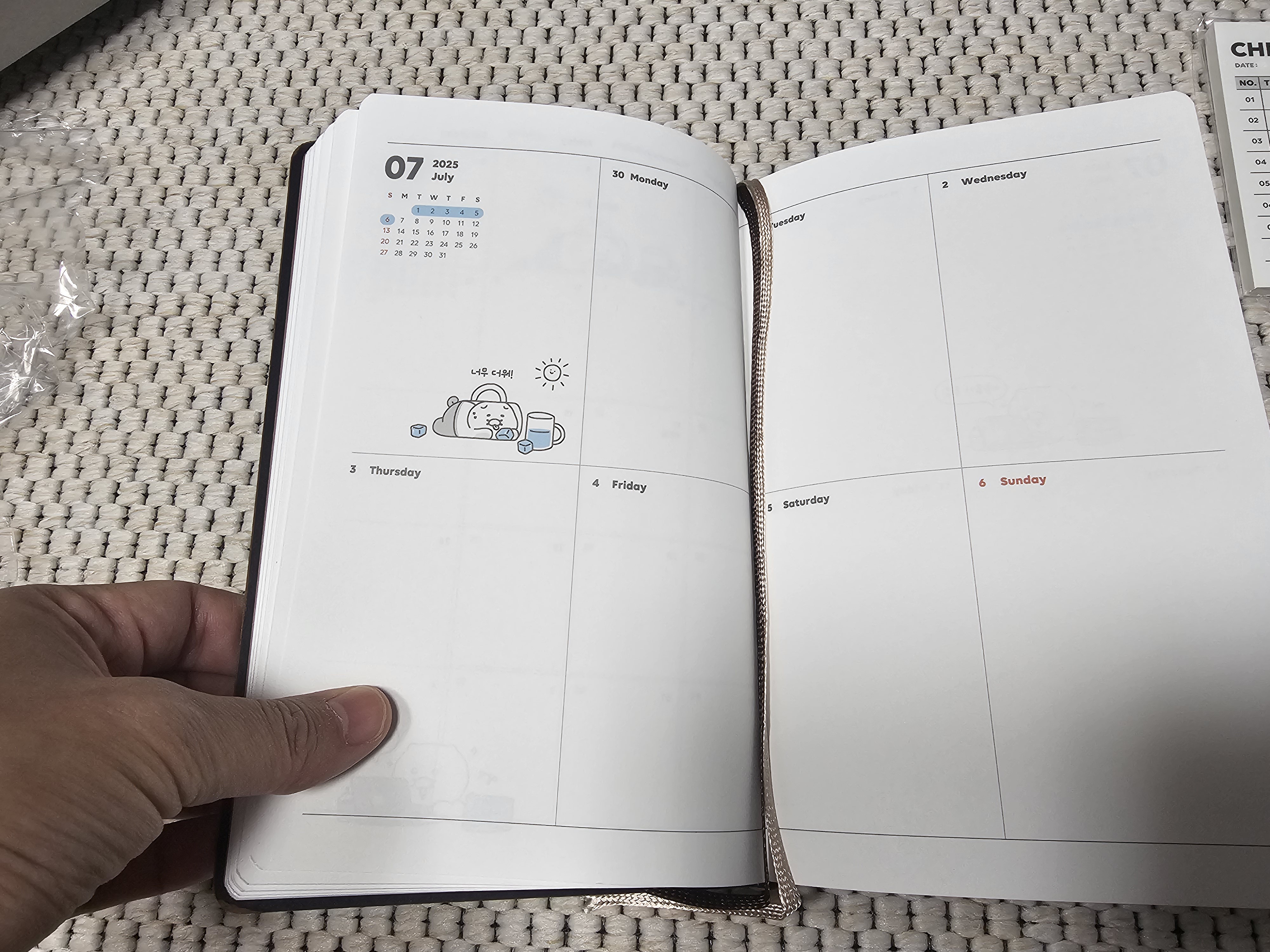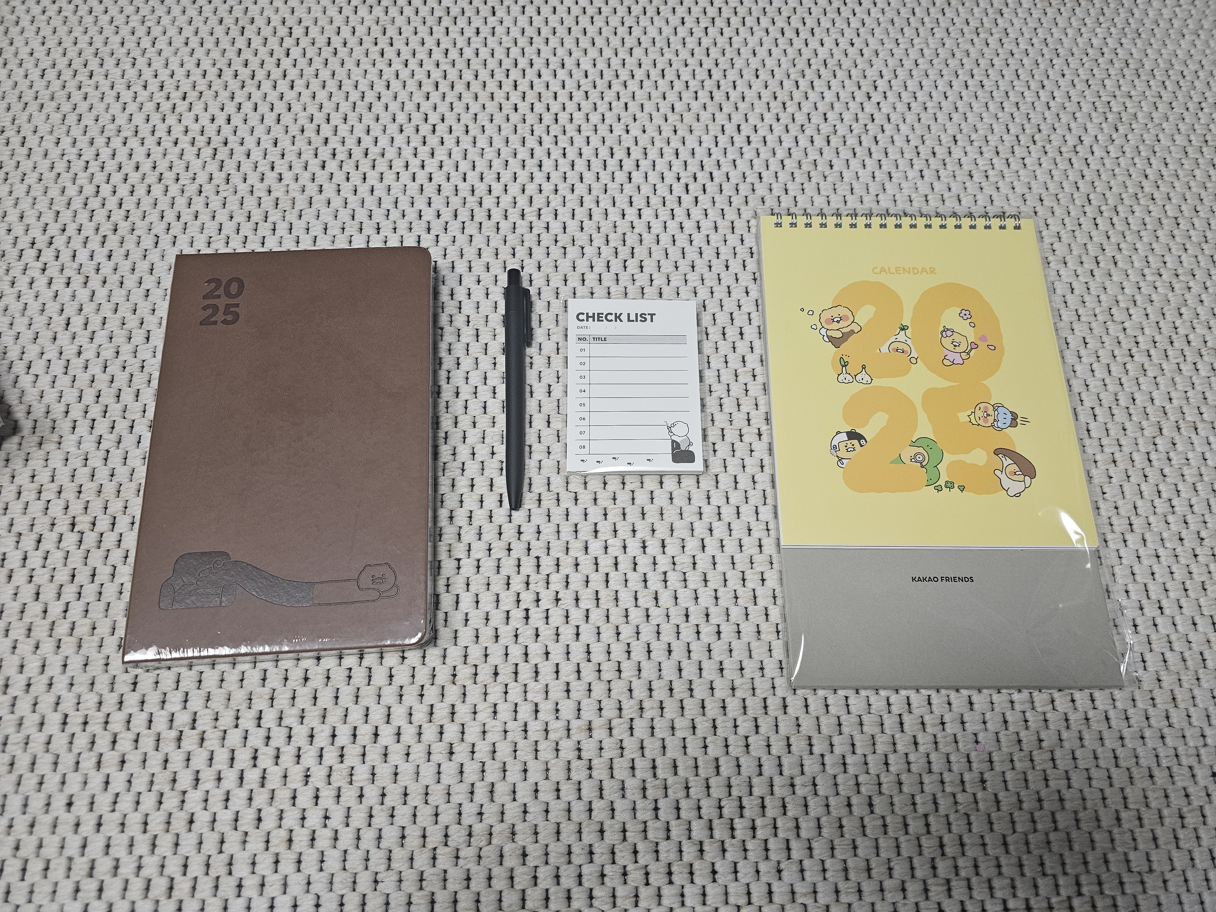 보통 카카오프렌즈는 가격에 비해 퀄리티가 좀 떨어지는 편이라 선호하지 않는데 다이어리는 퀄리티도 좋고 딱 쓸만하게 구성해놨다.