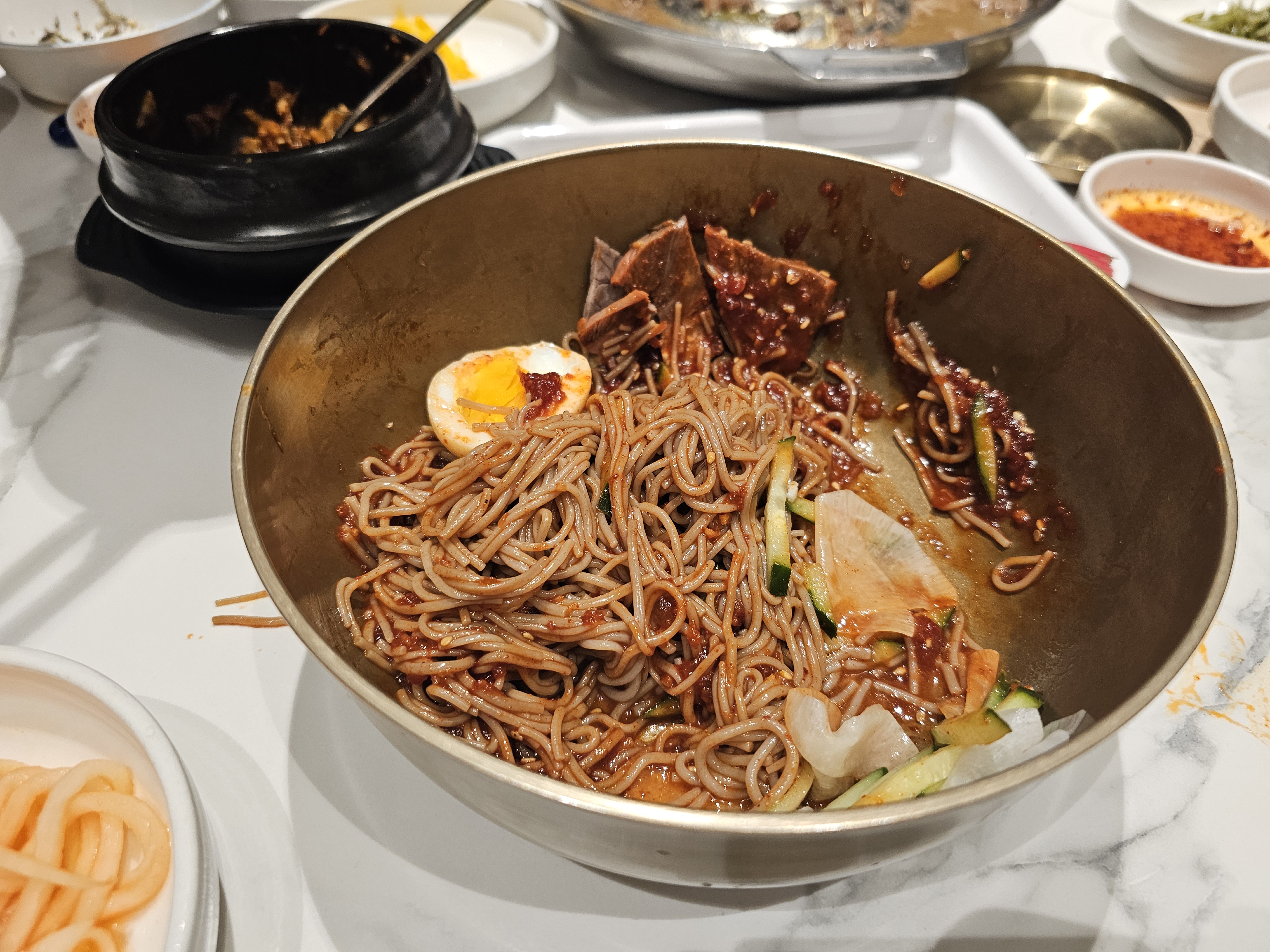 곱창전골만 먹어도 배불렀는데, 어쩌다가 비빔냉면을 주문했다. 근데 정말 맛있다. 간이 쎄지도 않고 그 특유의 평양식 밍밍한 맛?에 양념이 더해지니.. 김치로 따지면 겉절이 같은 느낌?! 이제 사리원에 오면 곱창전골과 더불어 이 냉면도 같이 주문해 먹을거 같다.